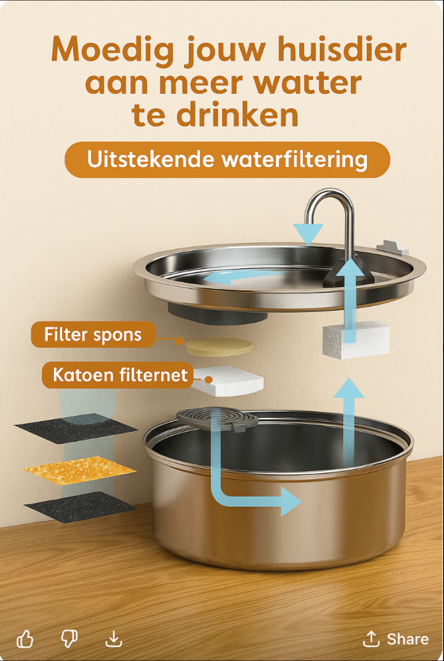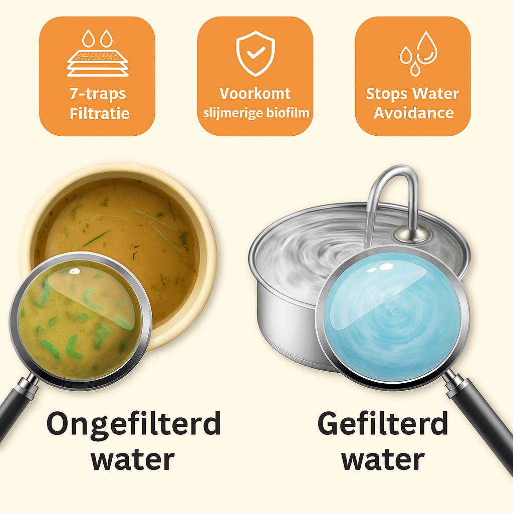 Dankzij deze slimme filtering blijft het water zuiver, fris en aantrekkelijk om te drinken, waardoor jouw hond of kat automatisch meer water binnenkrijgt — essentieel voor hun gezondheid, hydratatie en vitaliteit.